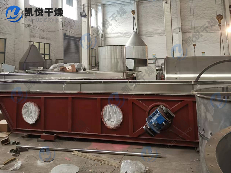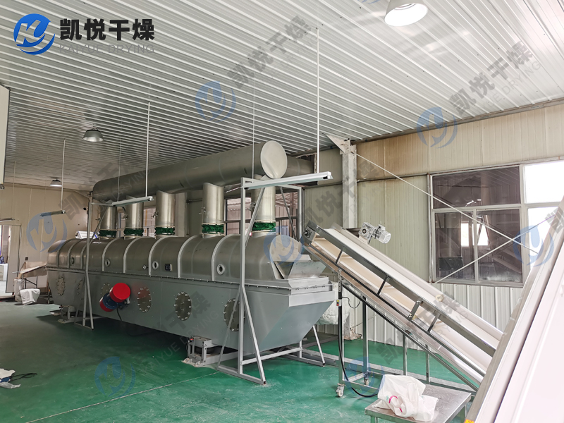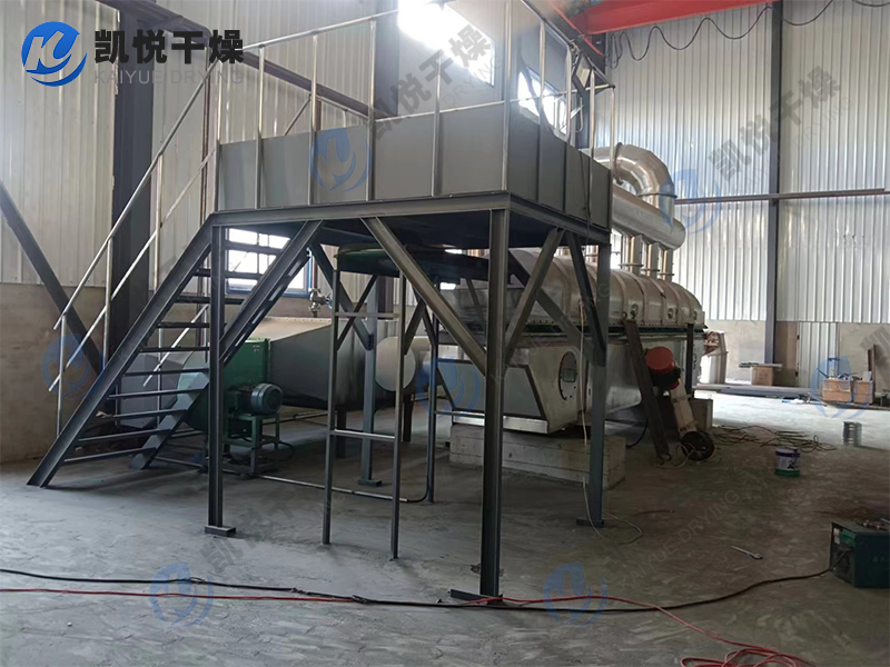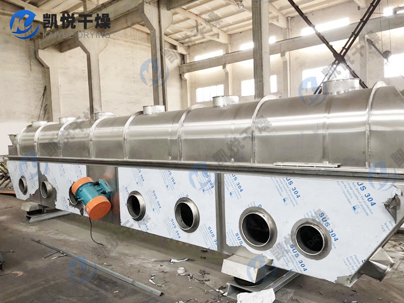 物料自进料进口进入机内,在振动力作用下,物料沿水平面流化床抛掷,向前连续运动,热风向上穿过流化床同湿物料换热后,湿空气经旋风分离器除尘后由排风1:3排出.干燥物料由排料进口排出。
