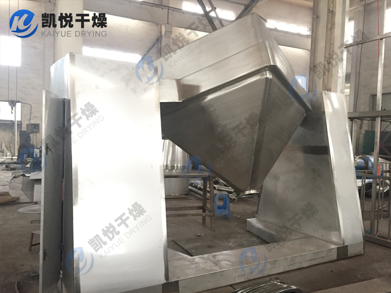 将物料装入方锥形密闭混合桶内,料斗对称的轴线与回转轴轴线成一夹角,不同组分物料在密闭的料斗中进行三维空间运动,产生强烈翻转和扩散收缩作用,达到佳的混合效果。