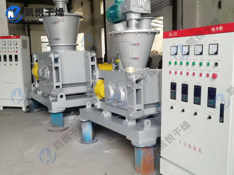 粉状物料由振动给料斗经横向螺旋送料器定量,均匀地加人轧片主料斗,使轧片主料斗内保持恒定的料粒,然后由轧片主料内的纵向锥螺旋对粉料进行预压缩并输送到两只压辊的弧形槽口,两只压辊表面均匀分布形状相同的半扁圆形弧槽或菱形槽,通过一对齿轮的啮合传动,使两只压辊等速,反向旋转,将锥螺旋输送至槽口的物料咬入槽内并瞬间强制压缩,物料经过压缩后随着压力逐渐减小在其弹力及重力作用下,从槽内脱落,进入破碎整粒系统,然后根据用户的粒度要求过筛、分级,得到符合质量要求的均匀颗粒状产品,筛下粉重新返回振动料斗循环利用。
